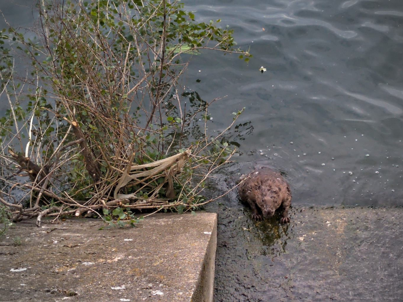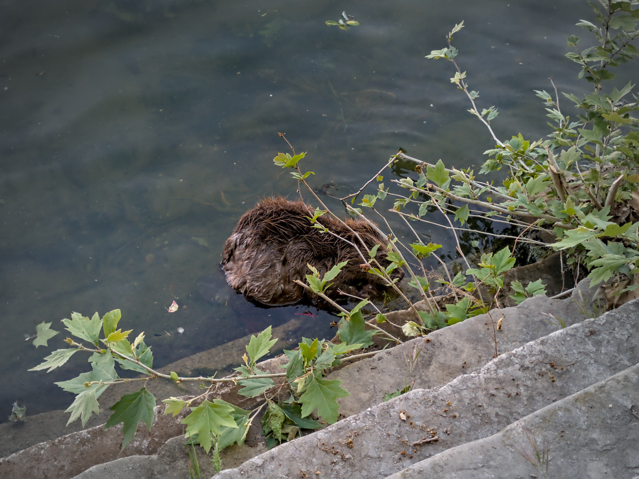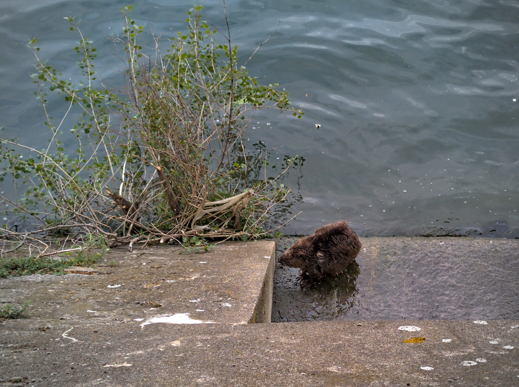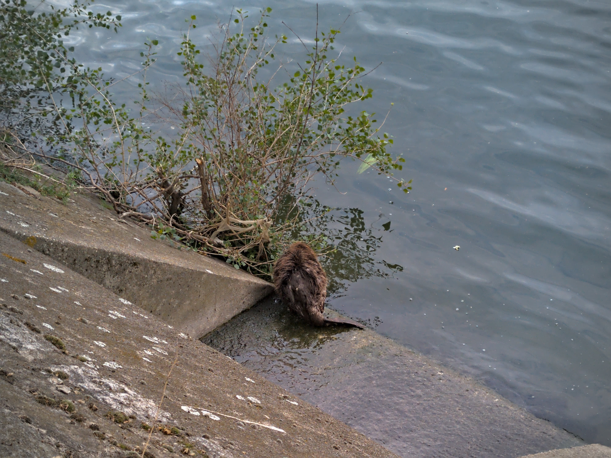Et oui, une magnifique femelle castor s'est visiblement bien plu sur le quai et a élu domicile dans une des cavités en bas du contrefort, au ras de l'eau. Il semble qu'elle soit allaitante, comme on peut le deviner sur cette vidéo de sa toilette :