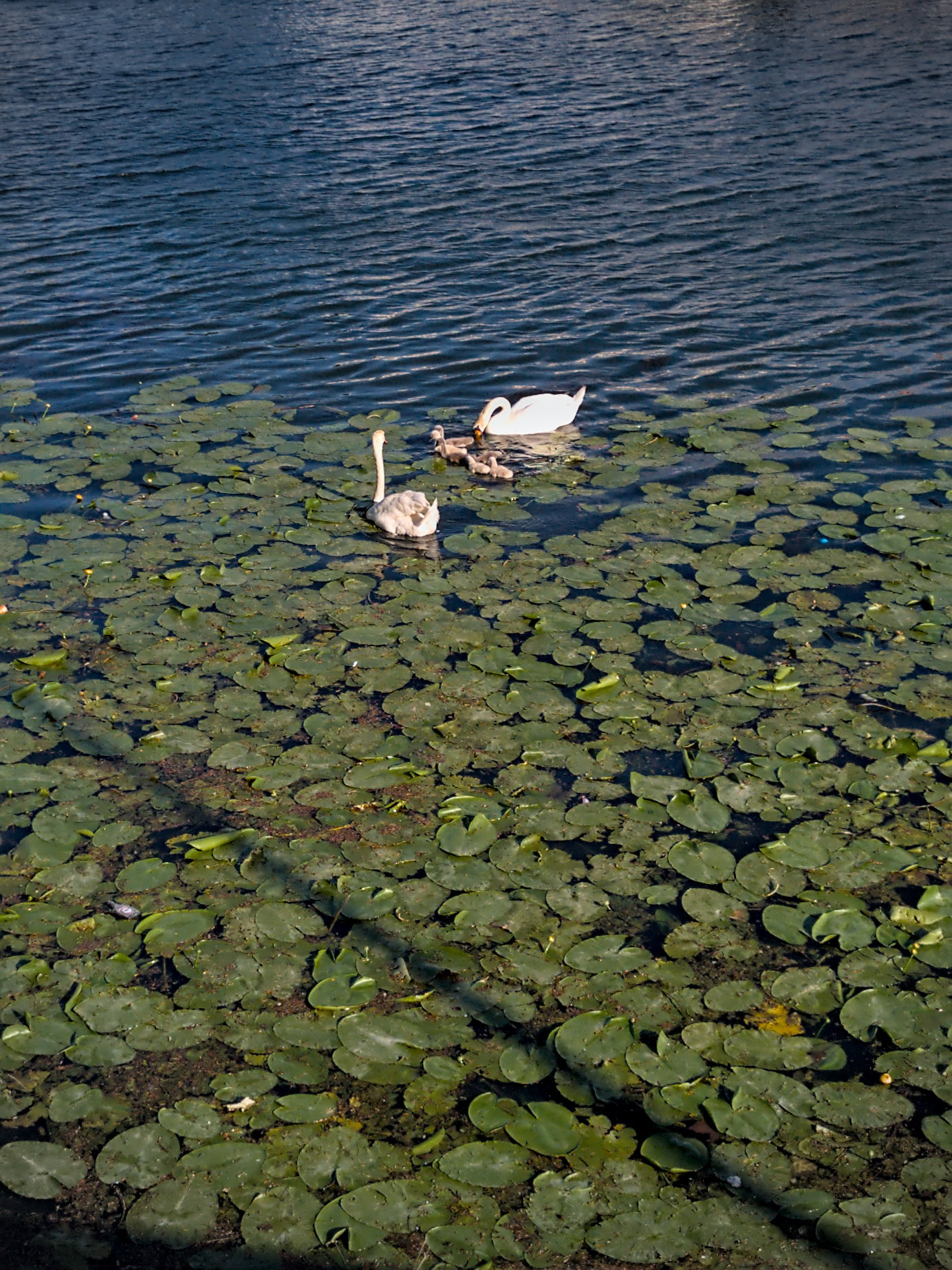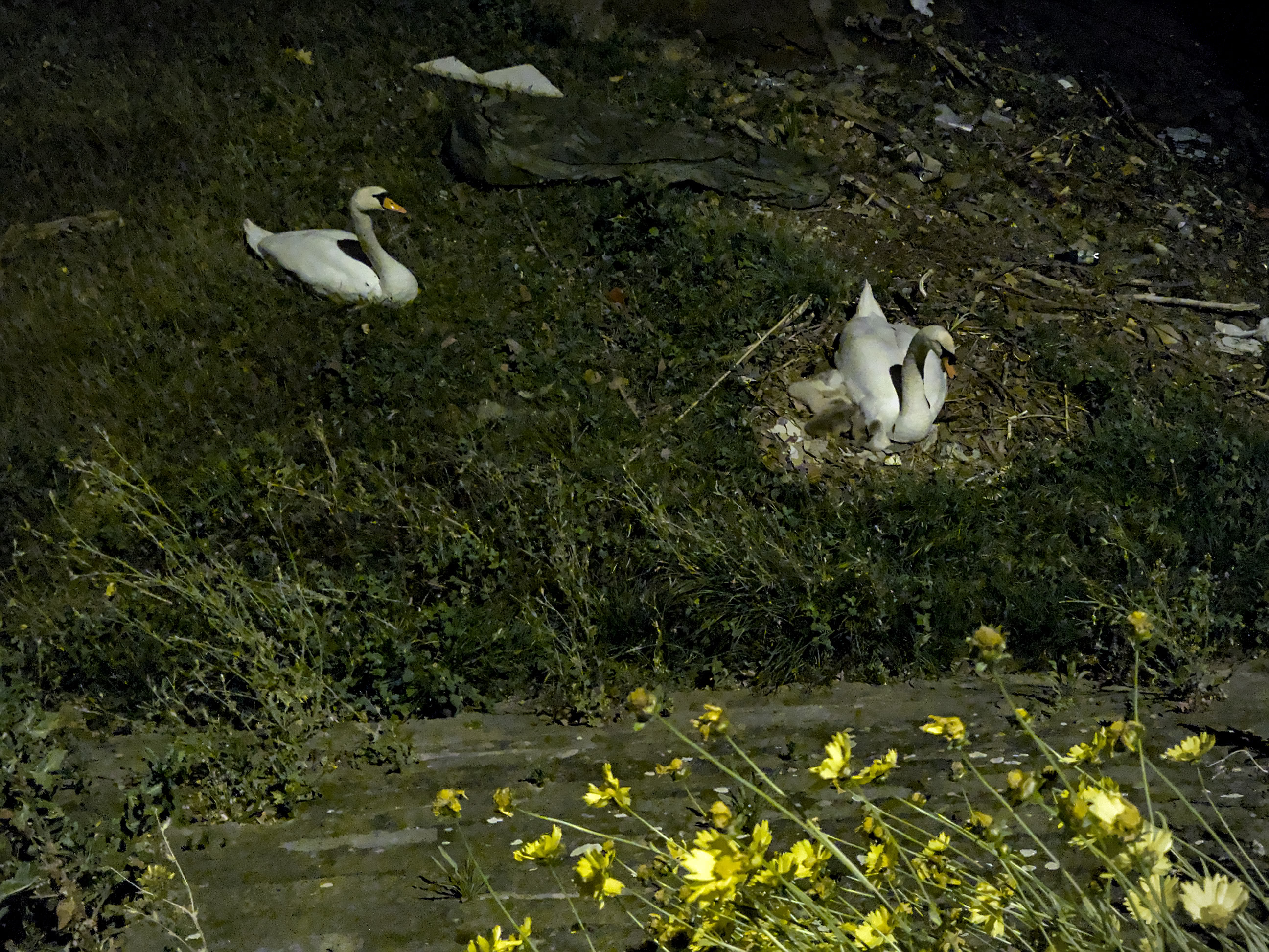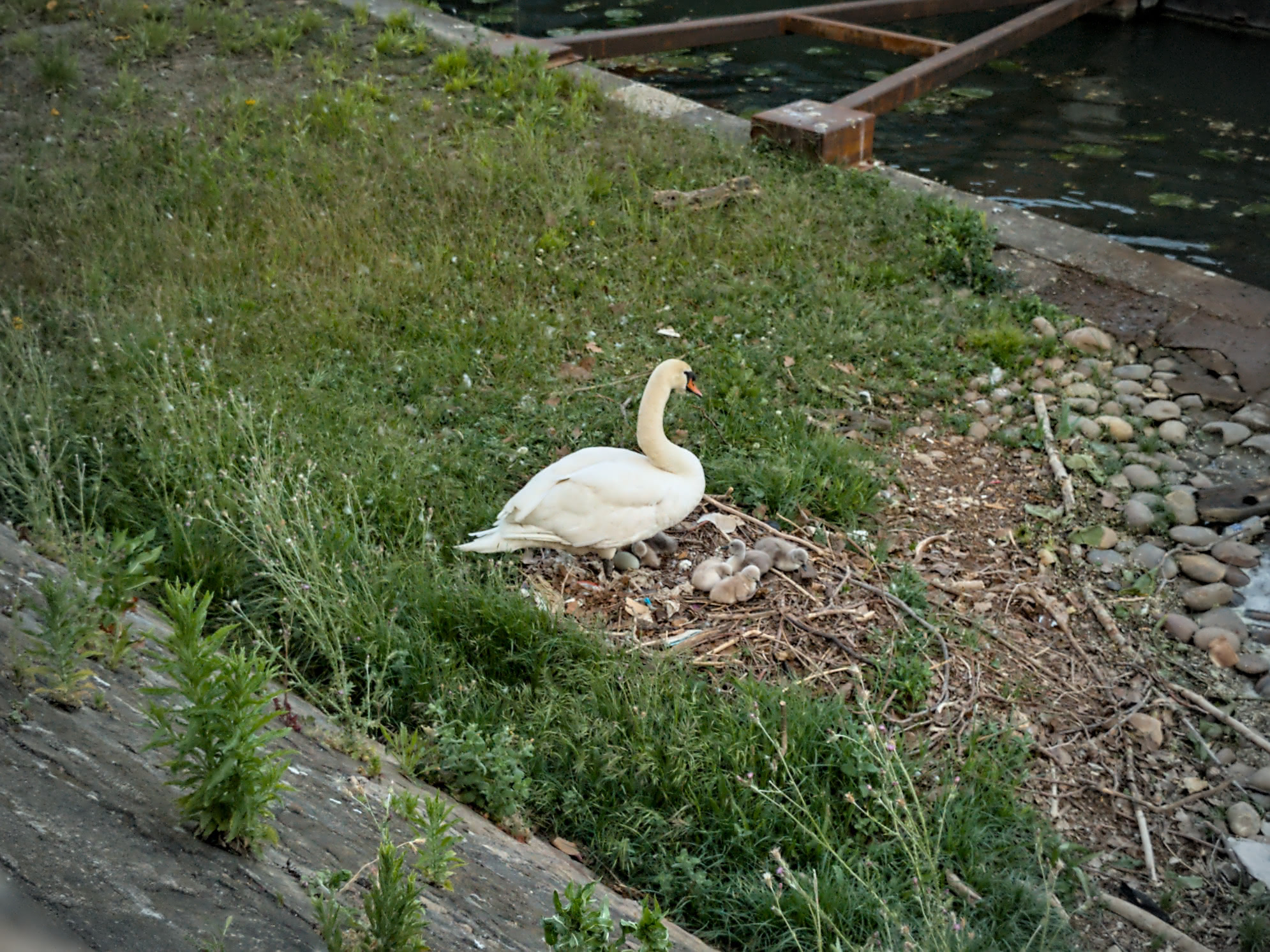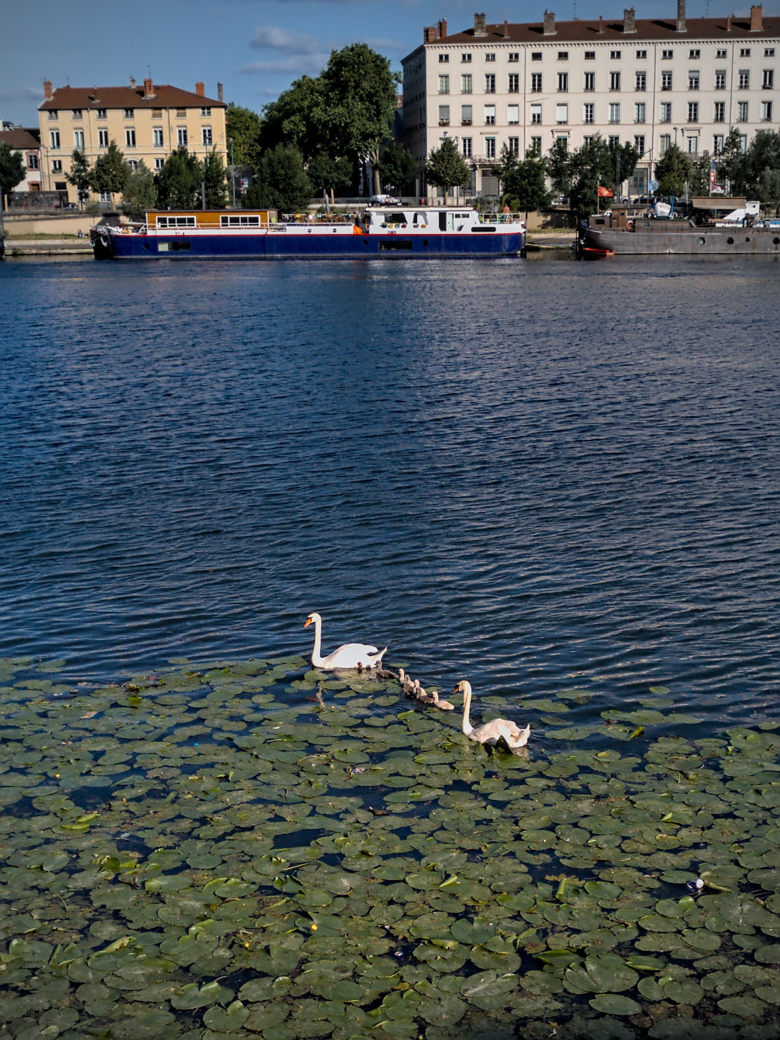 Pour se consoler on peut voir un peu plus loin, sur la berge devant la péniche de la Mulatière, la couvée de cygnes qui a éclos (7 petits et un œuf non – encore ? – éclos) :